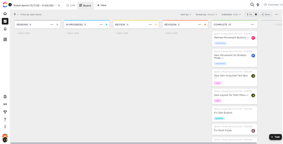 Producer: I filled the role of Producer alongside my level design responsibilities. As producer, I had been in charge of creating and managing tasks within the team's ClickUp. When approaching task breakdowns, weeks began with team meetings where we prioritized work for each specialization. I broke down the prioritized features or issues into a list of tasks for the week. We split tasks into three groups, programming, art, and design. Each team member had at least one assigned task from the outset of the sprint. After completion of that first task, team members would self-assign tasks from the remaining work assigned to their specialization. The main reasoning for this approach was team availability. Most team members were developing other projects alongside IMUGI. This time split made availability inconsistent and was causing tasks to be leftover at the end of sprints. This approach allowed for the most precise picture of what would be able to be completed during any given sprint. The result of this picture allowed me to adjust scope and the next sprint plan accordingly. Throughout any given week, there were two team meetings where progress and current task statuses were discussed. Alongside these general team meetings, we also had individual meetings to discuss current tasking or assist with ongoing issues. Utilizing this method, I observed a 183% increase in productivity from the week I was onboarded up to the project’s launch day. I measured this increase in productivity by comparing the number of tasks that were marked as “complete” throughout the project. Here are some screenshots of boards used to track tasks: